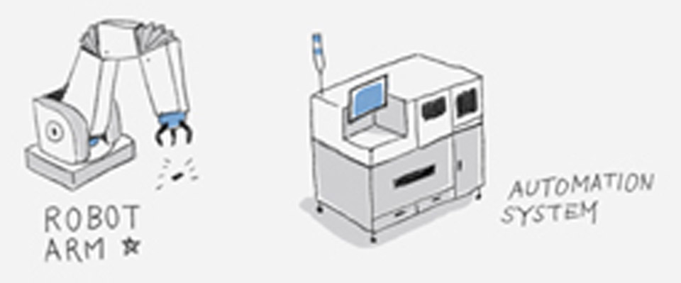 Robot Arm을 이용한 시스템 제작은 자동화 시스템의 기본이자 핵심을 이루고 있습니다. Cell Handler, Loader, 소형Parts의 분류 및 위치 이동 간단한 작업들에 이르기까지 무수히 많은 산업분야에서 이를 활용하고 있습니다. 소형 로봇부터 대형 로봇을 이용한 시스템의 설계, 제작, 제어를 하고 있습니다.